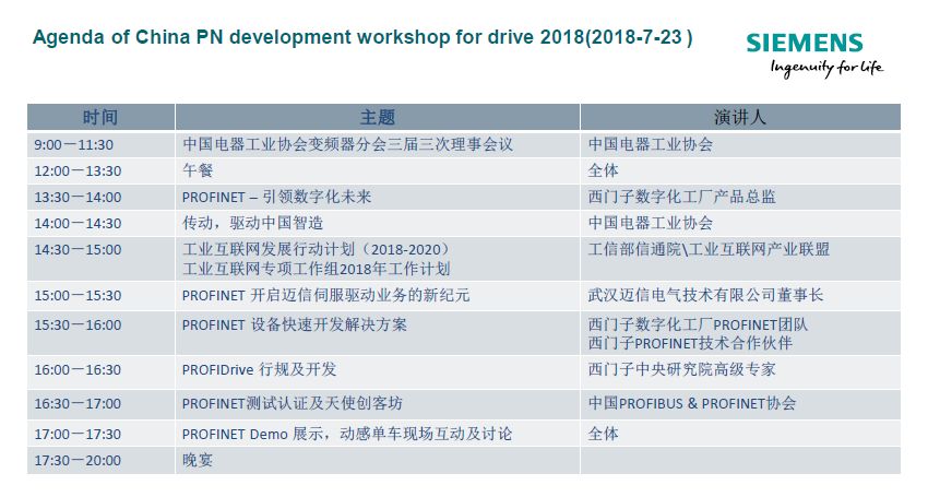 2018年7月23日~24日,中國電器工業(yè)協(xié)會變頻器分會三屆三次理事會暨西門子PROFINET技術(shù)開發(fā)傳動專題研討會在北京隆重舉行。武漢邁信電氣技術(shù)有限公司作為國內(nèi)首家成功研發(fā)出PROFINET伺服并支持PROFIDrive行規(guī)的伺服廠商受邀參加。