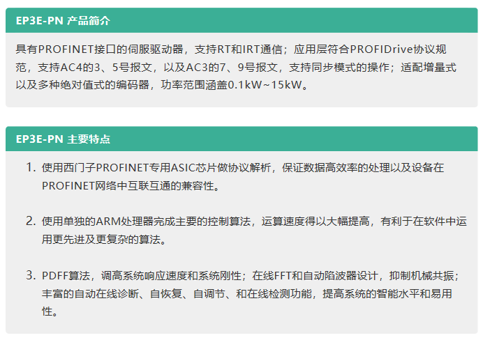 同時(shí),作為國(guó)內(nèi)首家成功研發(fā)出PROFINET伺服并支持PROFIDrive行規(guī)的伺服廠商,我們將為用戶帶來(lái)集穩(wěn)定可靠與高性價(jià)比于一身的EP3E-PN PROFINET總線伺服系統(tǒng)。